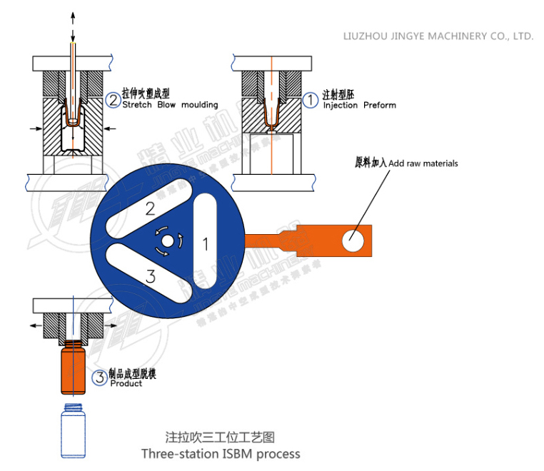 其中三工位機型的布局是:第一工位注射瓶坯,第二工位拉伸吹瓶,第三工位脫瓶。