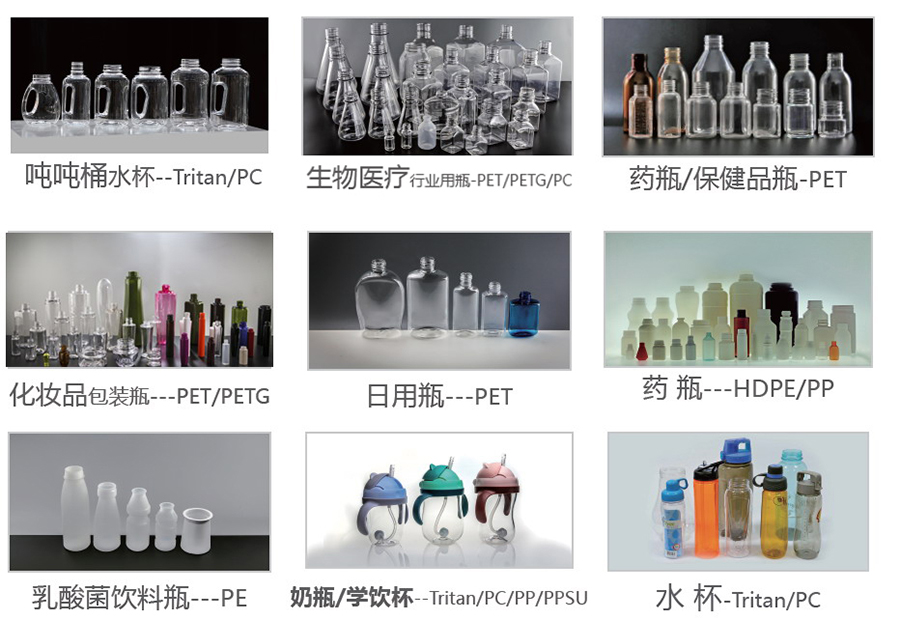 公司產(chǎn)品應用領(lǐng)域涵蓋醫藥包裝、食品飲料包裝、化妝品包裝、運動(dòng)水杯、嬰兒奶瓶、LED燈球等。制品可用原料:PET,PETG,PC,PP,PPSU,HDPE,LDPE,PS,PES,PCTG(Eastman Tritan Tx1001/Tx2001) ,SK YF300等。